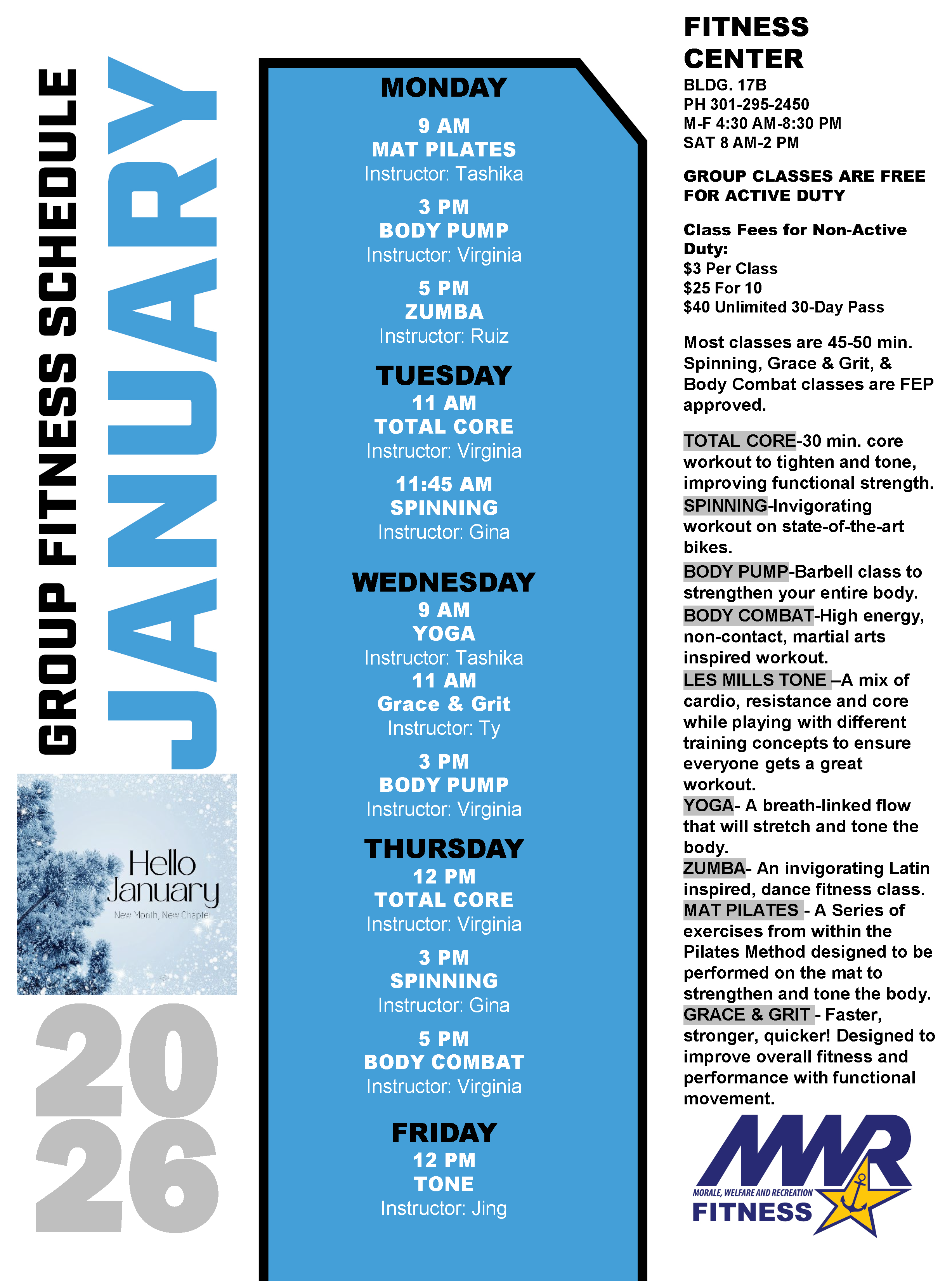 Please Note: MWR Fitness Center is a cashless facility. Accepted forms of payments include credit cards, Apple Pay and Google Pay.